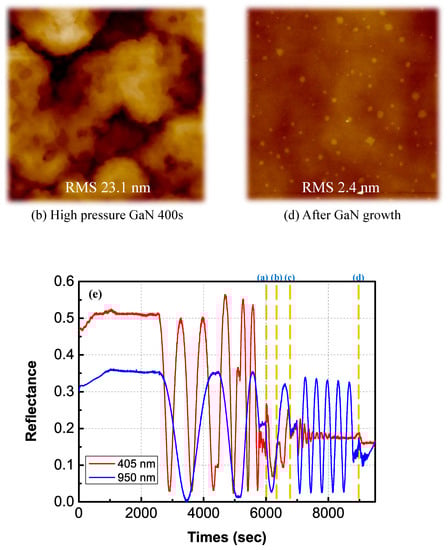 AFM morphology analysis at different growth steps in Sample B3 after (a) AlGaN buffer, (b) HP-GaN NL 400s, (c) HP-GaN NL 800s, and (d) the growth of the AlGaN/GaN HEMT structure. (e) In situ measurements of reflectance (405 and 950 nm) during the growth of Sample B3.
