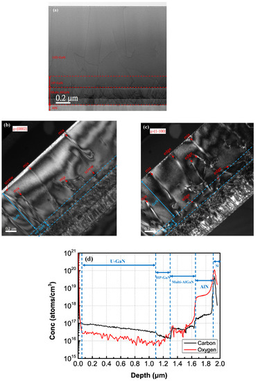 To verify the material compositions of each layer, the SIMS analysis was performed, and the composition profiles of the AlGaN/GaN HEMT device structure with HP-GaN NL are shown in Figure 4d. From the depth profiles, C and O atoms were observed at a distance of around 1 μm below the surface, showing the low O and C content in the UID-GaN and HP-GaN NL. The carbon doping level of HP-GaN NL was around 1.5 × 1016 atoms/cc, and similar results were observed in the previous work [25]. The results indicate that lower carbon concentrations in the GaN film could be obtained by increasing the growth pressure.