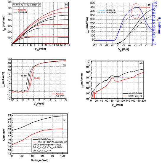 It is obvious that the device with HP-GaN NL exhibits higher device performances, lower off-state leakage current, and better Ron stability under VD stress. This is mainly due to the suppression of the leakage path from the AlGaN buffer by HP-GaN NL. In summary, compared to other groups, HP-GaN NL inserts between U-GaN and AlGaN buffer were able to improve device performance and maintain off-state breakdown voltage [20]. It was thus concluded that the mitigation of the threading dislocation density from the buffer layer was essential for the device to be used for electronic applications.