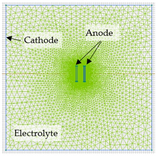 The system was modeled in ELCUT software v. 6.3 (TOR, St. Petersburg, Russia) that solves the Laplace equation based on a static model of the electric field in conductive medium. The “Electric field of direct currents” problem type was chosen in the ELCUT software to analyze the field in the electrolyte during the PEO process. Figure 2 illustrates a grid of finite elements. “Cathode,” “Anode,” and “Electrolyte” block properties were set up; the electrolyte-specific conductivity was set as measured above. Potentials of 0 and 480 V were attributed to the “Cathode” and “Anode” as boundary values, respectively. Because the coating is approximately three times thinner than the sample, it was modelled with a thickness of 0.2 mm for visual purposes. The ratio of the magnitudes of the current and voltage pulses on the recorded waveforms, taking into account the electrolyte resistance and sample area, was used to determine the coating-specific conductivity, following the approach developed elsewhere [18].
