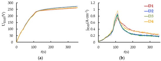 PEO process electrical response for the treatment of Zr1%Nb samples: (a) RMS voltage; (b) RMS current density.