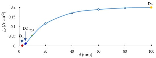 Typical current density distribution around the anode sample is shown in Figure 4. Figure 5 shows the relationship between the current density and distance d. The mutual influence of the plates decreases as the distance d grows, and the current density tends to maintain constant.