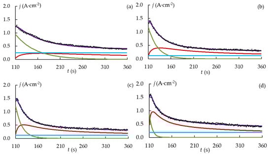 where j0—initial (maximum) current density magnitude; m—type of crystallisation; z—nuclear charge; F—Faraday’s constant; c—concentration of metal in the coating; D—diffusion coefficient; τ—time constant of nucleation; and jC—constant current density for the oxygen evolution. The transient plots of the anodic current density magnitude values were interpolated using the Curve Fitting Toolbox (Matlab); the coefficient of determination R2 was used to characterize the goodness of the fit.