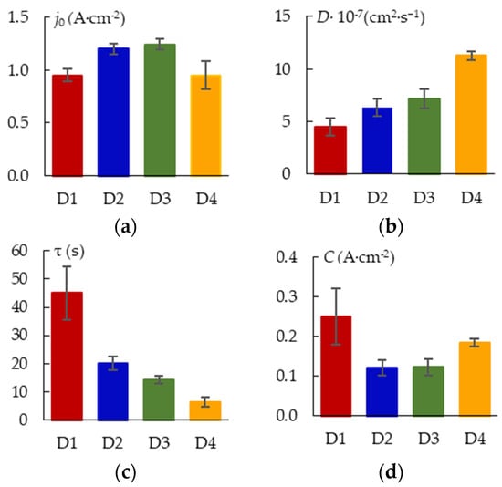 Parameters of the kinetic model: (a) j0; (b) D; (c) τ; (d) jC.