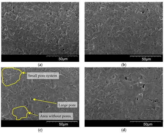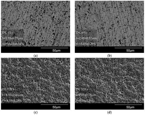 Figure 12 shows SEM micrographs of the surface of samples D1 and D4 after the PEO during t = 60 s and t = 120 s; the corresponding pore area distribution is shown in Figure 13. The coating surface morphology after t = 360 s PEO is shown in Figure 8a,d and described in the previous section. The voltage pulse magnitude increased from 0 to 170 V during PEO time t = 60 s. This duration covers the electrochemical anodization stage. The black dots visible on the SEM micrograph in Figure 12a,b can be related to the anodic dissolution of the alloy. Sample D1 has lower coating thickness h and a higher area subjected to the anodic dissolution of S3 compared to sample D4. The voltage pulse magnitude reached 480 V during the treatment time of t = 120 s. Spark microdischarges caused the porous surface (Figure 12c,d) to form. For samples D1 and D4, the coating thickness and porosity p-values are statistically equal; this is consistent with the similar pore area distributions (Figure 13).