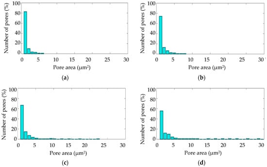 Pore area distributions for the PEO coating on Zr-1Nb for samples: (a) D1; (b) D2; (c) D3; (d) D4.
