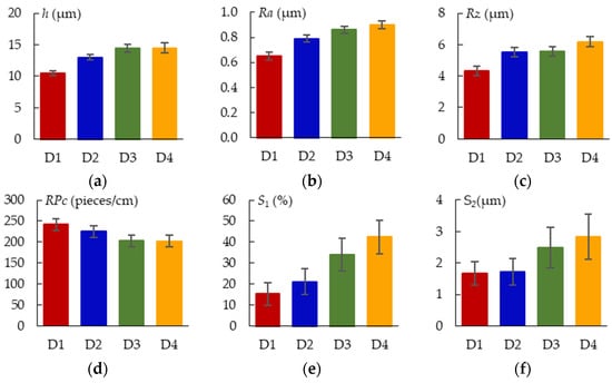 Parameters of the PEO coating morphology: (a) h; (b) Ra; (c) Rz; (d) RPc; (e) S1; (f) S2.