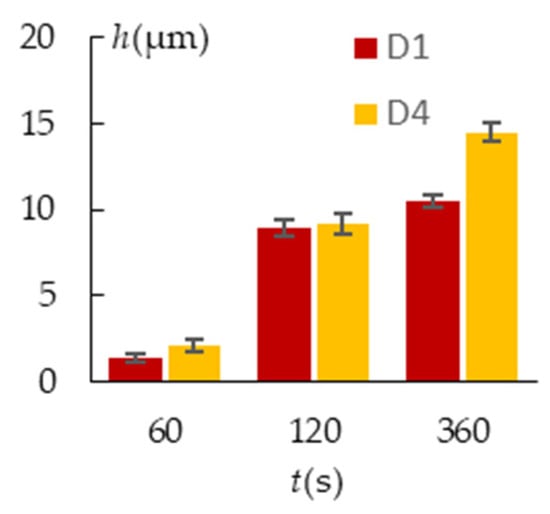 Due to stronger microdischarges that are developed throughout the treatment time of t = 360 s, the pores on the surface became bigger (Figure 8a,d). Sample D1 coating thickness grew by 14 ± 4% compared to the thickness gained by 120 s, and sample D4 coating increased by 36 ± 3%. Figure 14 displays a comparative coating thickness plot.