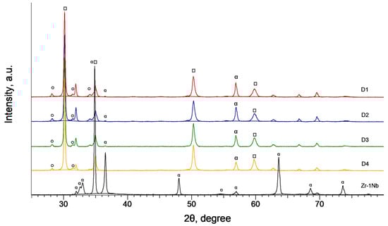 XRD diffractograms of the coatings formed on Zr-1Nb alloy after PEO treatment. ๐—m-ZrO2, □—t-ZrO2, α—α-Zr.