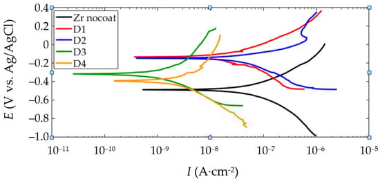 PDP plots of the electrochemical evaluation in Ringer’s solution for the PEO coated samples.
