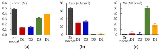 Results of potentiodynamic corrosion evaluation of the PEO coated samples in Ringer’s solution: (a) Ecorr; (b) Icorr; (c) Rp.
