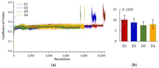 Coefficient of friction during pin-on-disk test for the PEO coated samples, 10 N load: (a) COF vs. revolutions; (b) number of revolutions until failure for different plate arrangements.