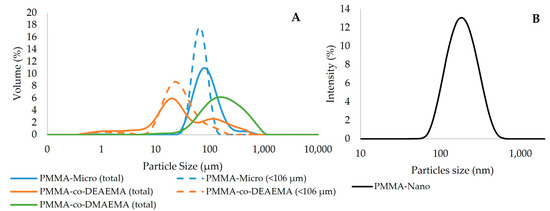 (A) Particle size distributions of the produced polymer microparticles. (B) Particle size distribution of the produced polymer nanoparticles.