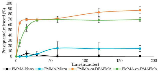 Figure 2 shows the release profiles of PZQ from the different polymer matrices. As expected, the protonation of the comonomers at lower pH values led to swelling of the particles and faster release of the drug, as reported previously for other microscopically dispersed systems [6,22,42,43,44]. It is important to mention that the smart microparticles exhibited PZQ release rates that were higher than the ones observed for PMMA nanoparticles, emphasizing the existence of chemical and physicochemical characteristics that can balance the presumably higher diffusional resistance offered by the larger microparticles. In the case of smart copolymers, the release mechanism involves two simultaneous steps. First, the particle is swollen with water in acidic stomach conditions, reducing the diffusion resistance for drug release. Then, the drug diffuses into the bulk acidic aqueous medium, where it is absorbed by the body. When compared to the other analyzed polymer matrices, the much lower diffusion resistance offered by the swollen smart particles can explain the better performances in terms of PZQ concentrations in the plasma. When compared to the free PZQ form, the amorphous nature of the PZQ molecules dissolved in the smart polymer particles [20,21,22] can explain the faster and more efficient release of PZQ in the body. In this case, the smart microparticles based on PDMAEMA and PDEAEMA are biocompatible cationic polymers characterized by the presence of tertiary amines in their side chains, which are characterized by pH- sensitivity. In short, pH-sensitive polymers are characterized by the presence of ionizable groups in their structures, presenting physicochemical properties dependent on this variable. These groups can be acidic (for example, carboxylic acid) or basic (for example, ammonium ions), which can accept or release protons in the face of changes in pH, so that, when they are charged, they generate electrostatic repulsions that allow an increase in the hydrodynamic volume of chains and polymer solubility [42,45].