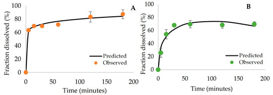 To model the release profiles, the Excel plugin DDSolver was used [32]. The tested kinetic models were the zero-order, first-order, Higuchi, Hixson–Crowell, Korsmeyer–Peppas, Hopfenberg, and Peppas–Sahlin models [33].
