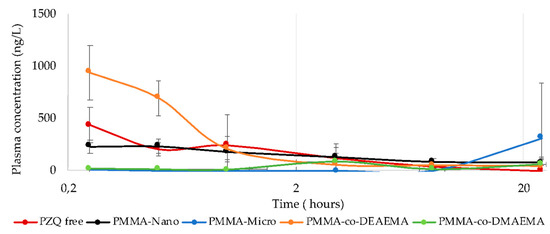 The results presented in Figure 4 shows that, after 10 min of oral administration, it was already possible to detect the presence of PZQ in the samples, even when PZQ had been encapsulated, and it continued to be observed after 20 h of testing. Furthermore, it is possible to observe a clear difference between the different evaluated systems. As observed, PZQ in its free form reached its maximum concentration (near 400 ng/L) after 15 min of oral administration, reaching higher plasma concentrations in the case of PMMA microparticles and similar to those observed with PMMA nanoparticles. Thus, the results seem to indicate that the drug release process through these systems was, in some way, impaired, probably being dependent on the diffusion process through the polymer matrix. In this context, it is important to observe that the PMMA microparticles presented a delayed release effect, reaching their maximum plasma concentrations in relatively longer times than the nanoparticles, confirming the diffusional resistance through the larger average diameters in the living organisms and in contact with the actual body fluids. Such results seem to emphasize that particle size is an extremely important parameter that must be taken into account with regard to the release process in the gastrointestinal tract [50].