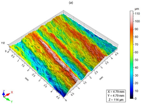 Surface roughness parameters relating to profile height are important due to mating the surfaces of two machine components. From the point of view of their interaction, it is favorable that Sku takes positive values (Sku > 3 and Sku = 3), which is most clearly seen when vf is 5 mm/min and 100 mm/min. Therefore, it can be concluded that for the analyzed case, the obtained surface is characterized by a low coefficient of friction. Less homogeneous results of the Sku kurtosis were obtained when ma = 4 g/s.