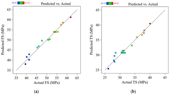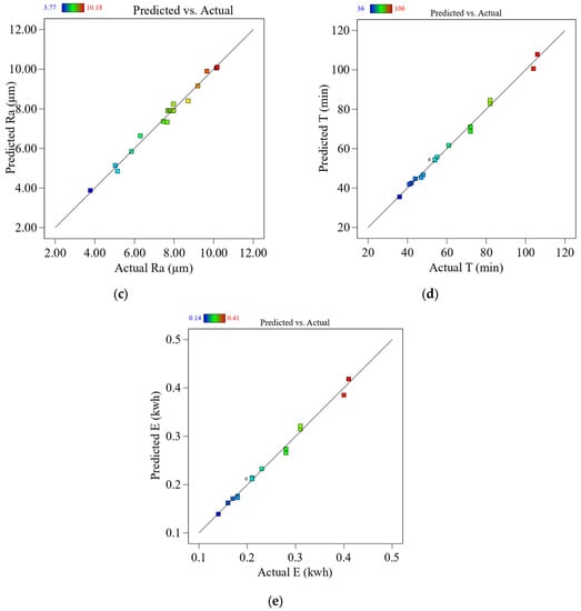 Before reaching any stronger conclusions, performing a residual analysis to test the assumptions behind the ANOVA results is critical. This is shown in Figure 4a–e as a comparison between the expected and experimental values for the FS/TS, Ra, T, and E. According to the experimental results, the predicted values are extremely close to the actual ones. To put it another way, this shows that existing models can accurately predict the answers.