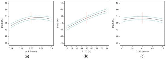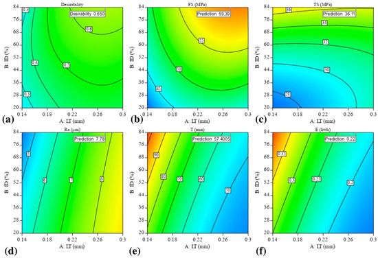 Figure 7a shows the FS with contour graphs, showing that the LT and ID combinedly contributed to increasing the highest ID value and about 0.25 mm of the LT. However, the TS value did not significantly increase by changing the value of LT, as shown in Figure 7b.