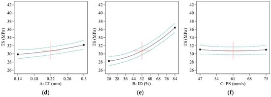 Figure 6d shows the TS sample at the highest level of TS in experiment 4. It shows well-packed layers with 100% ID, giving the sample bigger strength. TS showed the lowest value at experiment number 19 with a TS value of 26.14 MPa at the lowest value of ID as 20% and of thickness as 0.14 mm and PS at the highest value of 75 mm/s. At the mid of parametric value at exp number 5 (ID = 52%, PS = 61 mm/s and LT 0.22), as shown in Figure 6e, TS was found to be around 31.02 (see Figure 6h). Figure 6f shows the maximum and minimum TS values of the stress–strain curve. However, the PS remains less significant. Thus, the ID got dominated as an influencing factor on TS. The investigation coincides with the research performed by [46], where the PS was less significant than ID.