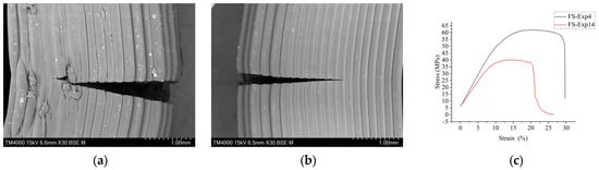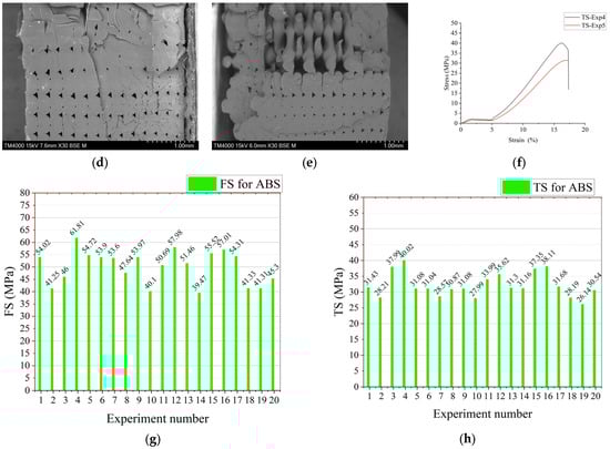Figure 6 shows the SEM images taken for TS and FS samples. Figure 6a,b show the SEM samples at the highest and the lowest values of FS, respectively. The highest level of FS was obtained in experiment 4. Figure 6a shows little distortion in layers, bulges, and micro crack due to some humidity in material [59,62]. It shows well-packed layers with 100% ID, which give bigger strength to the sample, and some layers were so packed that they were coming out of the samples, as shown in the micro-SEM image of Figure 6a. Figure 6b shows the FS sample at the lowest FS at experiment number 14 with an FS value of 39.47 (see Figure 6g), at the lowest value of ID as 20% and high level of thickness as 0.3 mm and PS at highest value as 75 mm/s. Figure 6c shows the maximum and minimum FS values of the stress–strain curve.