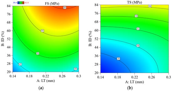 2D contour plots show the effect of the printing parameters and interaction on FS and TS; (a) effect of LT Vs. ID on FS, (b) effect of LT Vs. ID on TS.