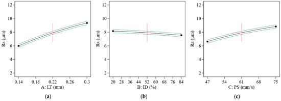 The effect of printing parameters on the Ra of the ABS polymer; (a) effect of LT on Ra, (b) effect of ID on Ra; (c) effect of PS on Ra. Red represents center point. Black is the average data line and green lines show the min and max of data.