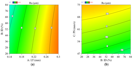 2D contour plots show the parameters’ effect and their interaction parameters on Ra; (a) effect of LT Vs. ID on Ra, (b) effect of LT Vs. PS on Ra.