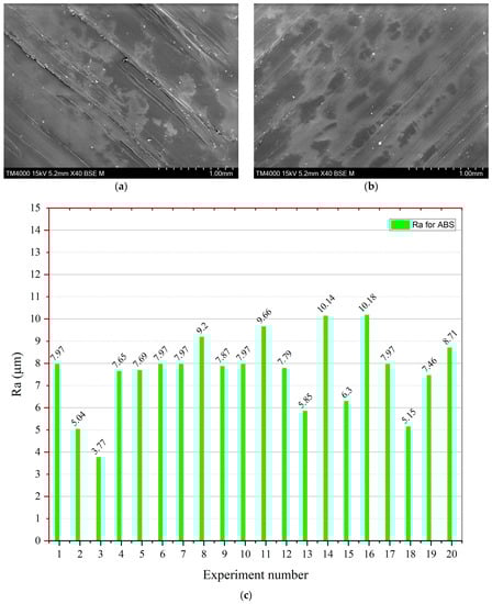 Ra increased dramatically along with the increasing PS factor (Figure 8b). A high PS may create ringing artifacts and even shifting layers. The Ra value increased at lower values of ID. However, as shown in Figure 9a in contour graphs, it did not considerably influence the Ra, and the literature investigation results correspond with the literature findings [36]. After experimentation, the author found that the minimum Ra value was 3.77 µm, and the highest value for ABS was 10.18 µm (see Figure 10c). The contour graphs in Figure 9a,b show the lowest Ra value at the lowest LT, PS, and ID.