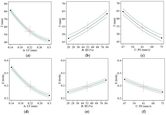 The T decreased as the machine’s speed rose because the printer head could finish the cycle rapidly when working at high speed. The fact that the machine is only used briefly means that the E uses less energy, as shown in Figure 12c,f. The contour’s graphs in Figure 13 clearly show that for ABS, the lowest value of T and E was obtained using the highest value of LT, the lowest value of ID, and PS. The research agreed with previous research [48].