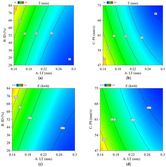 2D contour plots showing the effect of parameters and their interaction parameters on T and E; (a) effect of LT Vs. ID on T, (b) effect of LT Vs. PS on T, (c) effect of LT Vs. ID on E, (d) effect of LT Vs. PS on E.