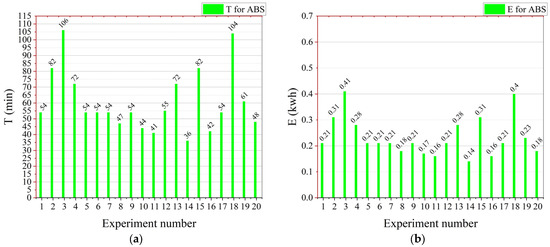 Figure 14a,b shows the T and E for PLA, respectively. According to Figure 14a, experiment number 3 took the most T, due to the high ID = 84%, lowest LT = 0.14 mm, and lowest PS = 0.47. Due to the longer T, it also had higher E, which was around 0.41 kwh. The PLA sample took the least time at exp number 14 of 36 min due to the lowest ID, highest LT, and the highest level of the PS. Due to this reason, the E of experiment number 14 also had the least E of 0.14 kwh.
