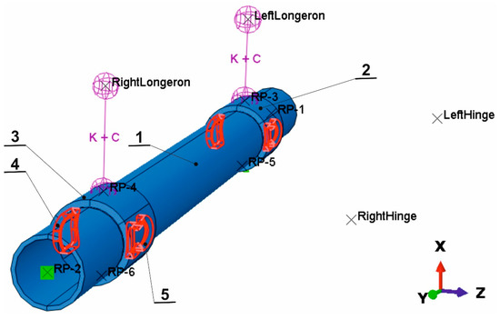 Assembly of the axle with constraint points on longerons and hinges: 1—axis; 2, 3—bushings; 4, 5—angle welds. RightLongeron, LeftLongeron, RightHinge and LeftHinge points have a rotational degree of freedom round the Y axis only. Between points RightHinge and RP-4, as well as RP-6, is rigid body type connection to the wishbone and a similar part is in model at the left side. Vehicle front at right.