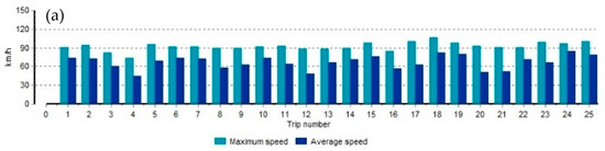 In Figure 2, we can see that the maximum speed was exceeded during almost every trip, with a speed of 90–110 km/h. In the load chart, we see journeys when the semi-trailer was running unloaded or with a small load and journeys when the semi-trailer was fully loaded. Comparing the speed and semi-trailer load diagrams, we see that the speeds were exceeded even when the semi-trailer was fully loaded.