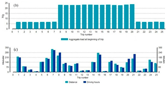 Characteristics of transportation parameters: speed (a), load (b), distance and time (c).