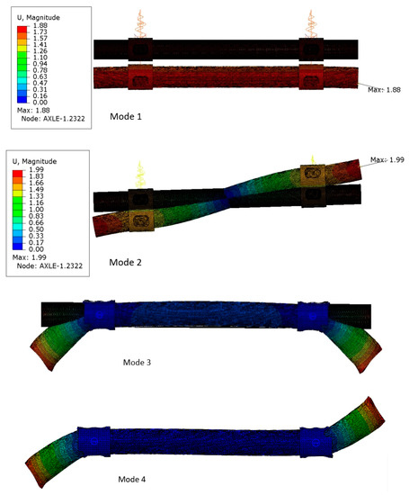 Modes of natural vibrations of the axle. Modes 1 and 2—view from the back side, modes 3 and 4—top view. Deformation scale factor 130.