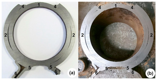We see that there is a gap between the shaft and the coupling connection, in places up to 1.5 mm (Figure 5a). To make sure that this is not the result of a fracture, but a construction, we also cut the part of the shaft without the fracture. In Figure 5b), we see that there is also a gap in the cross-section of the fractured side of the shaft between the shaft and the coupling joint. This confirms the assumption that the gap is not a consequence of a fracture [34].