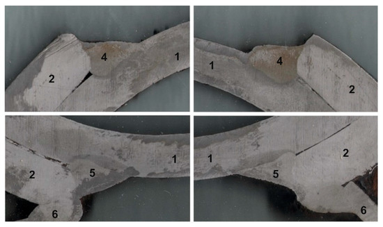 The integrity of the weld seam was inspected and no cracks were observed. After the section of the axle at the welded joints (Figure 6), the cross-sections of the welds were inspected. Defects observed: 402—Non-weld (insufficient weld), 500—Shape defects (irregular geometry of the weld, imperfect shape of the outer surface of the weld, different geometries of the cross-sectional area, cross-sectional areas of the weld vary from 6 to 20%), 505—Insufficient weld edges, 509—Depression (formed by gravity; the amount of the weld metal on the axle metal is higher than on the coupling metal; significantly greater thermal impact area), large angular seam asymmetry (excessive structural unevenness), 513—Uneven width (large seam width tolerances), 514—Uneven surface, 602—Splashes (added metal droplets spattered by welding and adhering to the base and hardened seam metal).