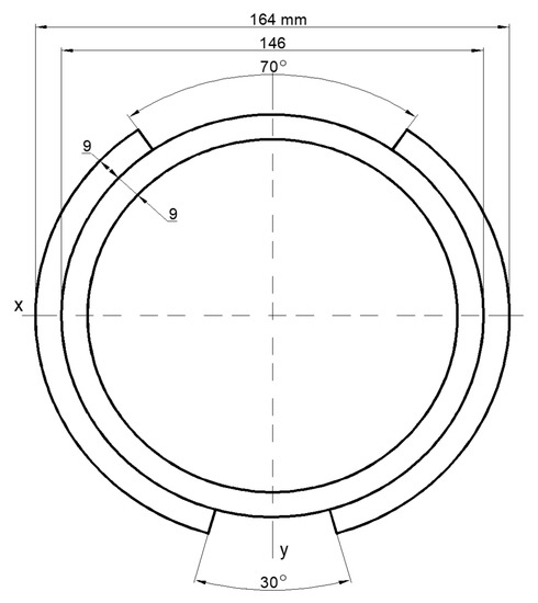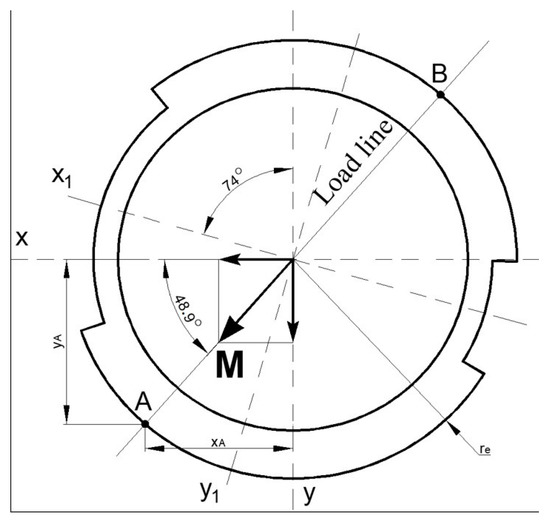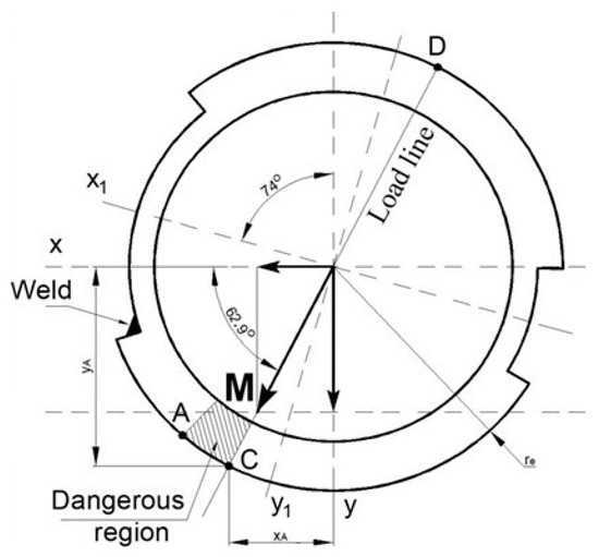 Points A and B are on the plane where sum moment M acting and normal stresses are extreme. From previous investigations [39], the position of the dangerous quarter has been found in the cross-section—front and down quarter. As a result, the normal stresses in point A are determined: