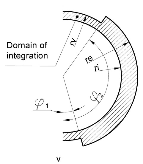 Due to symmetry, only half of the area is used as a domain of integration (Figure 8) for a solution of the polar moment of inertia.