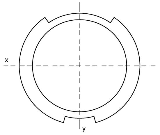 The geometry of the cross-section is calculated as a complex figure consisting of an annular tube with two external brackets (Figure 7). Additional areas in the cross-section of the welds and corbels (Figure 5) are unvalued. The moments of inertia of the cross-section of the axle are determined as a sum of the central annular tube and the two external brackets.