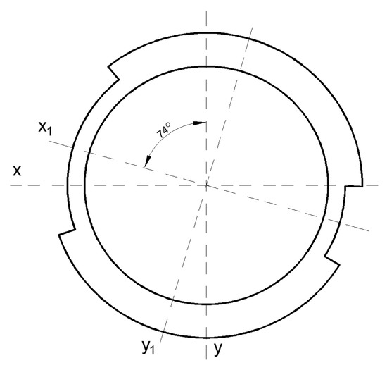 It can be seen that the second term of the sum in Equation (12) has the greatest influence on the stress value. With unchanged values of other parameters, a 20-degree left rotation of the system shown in Figure 12 could cause such an increase in stresses that they would reach the fatigue stress limit. The same effect could be caused by changing the direction of action of the unchanged value of the total moment M by about 20 degrees to the right. In this case, the angle would not be 62.8 but 42.8 degrees.