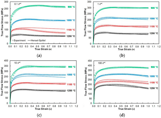 Figure 2 graphically compares the experimental and calculated flow stress courses in the form of flow curves. At first sight, it is evident that the flow stress course takes the expected trends, i.e., the flow stress growth with a decreasing temperature level and an increasing strain rate. One can see the Hensel-Spittel model is able to fit the experimental data well—though with an exception in the case of the temperature level of 1100 °C in combination with the strain rate of 0.1 s−1—see Figure 2a. However, it is noticeable that the course of the experimental curve under these conditions is out of the trend observed for the surrounding curves—the flow stress decrease seems to be somewhat overestimated. So, the overall performance of the applied model can be evaluated as high enough and the corresponding material constants in Table 4 can be used to predict flow stress courses under non-experimentally examined conditions.