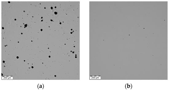 The printing parameters (a laser power of 200 W, a layer thickness of 0.05 mm, a hatch spacing of 0.06 mm, and a scanning speed of 650 mm·s−1) used during the building process influenced a formation of a structure that featured defects such as pores and voids (see Figure 3a). The defect can be caused by the protecting gas which was entrapped in the material during the deposition of the individual layers [58,59]. The residual porosity was evaluated in the middle height plane of the samples (see Table 3) due to the expectation of the highest porosity [41]. The ImageJ (version 1.53t) program was used for the evaluations of the residual porosity. The porosity evaluation was performed on the polished light optical microscopy image with the methodology according to Grove and Jerram [60]. The structure of the SLM and SLM + RS sample exhibited residual porosity of 1.836% and 0.051%. A significant reduction in the residual porosity was observed after the hot rotary swaging post-process (see Figure 3b) for every tested sample listed in Table 3. It can be concluded that the lower residual porosity can increase fatigue resistance due to the reduction in potential stress concentrators.