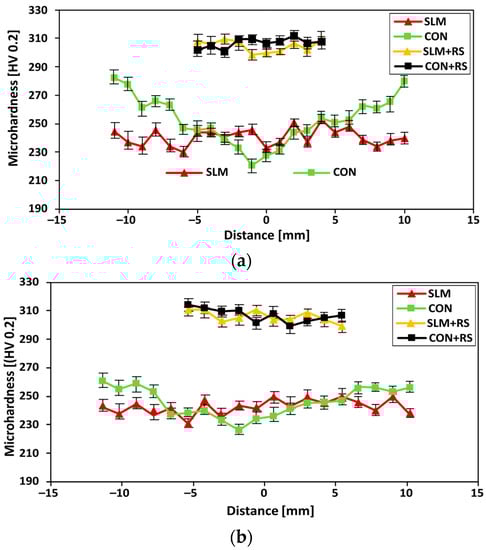 The dependence of the Vickers microhardness on a distance across the sample is presented in Figure 4. The microhardness of the samples corresponding with Table 3 was measured across each sample in the transverse (the XY plane, see Figure 4a) and in the longitudinal (the YZ plane, see Figure 4b) direction. The microhardness showed a similar trend for both the materials in the transverse direction as well as in the longitudinal direction. The lowest microhardness was measured in the vicinity of the border (230 HV) of the SLM sample in the XY plane, while the highest value (250 HV) was observed in the centre of the sample. The course of the measured microhardness exhibited such a wavy trend. These waves can be related to different regions appearing across the structure formed during the SLM process. The variation of the microhardness (an increase and a decrease) corresponds with two distinct areas with a different etching contract, i.e., darker areas of the tempered martensite and brighter areas presenting less extensive tempering [61]. The CON sample in the XY plane features a different trend, where the highest microhardness (280 HV) was observed in the vicinity of the sample surface, while the lowest (221 HV) was presented in the centre of the sample. This fact corresponds with the post-process rolling treatment (during the production), which affected mostly the surface area of the sample. The SLM sample in the YZ plane featured a similar wavy trend of microhardness as in the XY plane. The existence of two distinct areas (the melting pools structure with the different etching contrast is described in detail in the section: Microstructure observation) with a different microhardness corresponded to the following fact: the high melting temperature imposed heat into each deposited layer, which could cause partial tempering of the previously melted layer [62]. The post-process of hot rotary swaging caused an increase in microhardness in both materials. The average value calculated from all indentions exhibited 310 ± 5 HV and 311 ± 5 HV in the case of SLM + RS and CON + RS in both directions. It can be observed that the difference in the material microhardness (observed near the sample surface) diminished after post-processing. In other words, the hot rotary swaging affected the structure, which resulted in homogeneous microhardness (no wavy course has been observed) across the sample. A similar homogenization of a structure was observed by Chen et al. [63]. They found out that with the increasing post-heat treatment temperature the microstructure of the material gradually homogenized.