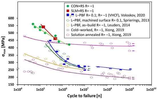 Test of the high cycle fatigue for SLM + RS and CON + RS samples. The figure also includes experimental data acquired by Voloskov et al. [65], Spierings et al. [66], Leuders et al. [67], and Xiong et al. [68]. The points indicated by the arrows correspond to specimens that were not disrupted during the tests.