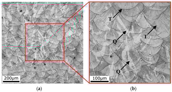 A detailed optical microscopy analysis of the SLM sample (corresponding to Table 3) was further carried out. Figure 7 shows LOM images taken of the as-fabricated sample. The sample exhibits a typical structure (characteristic melt pools featuring individual grains, see Figure 7a) formed during the melting process. The structure exhibits a region of the rapid cooling effect (Q = Quenched region marked in Figure 7b) and a region of partial tempering (T = Tempered region) described in Section 3.3. The quenched regions correspond to the characteristic martensitic laths. This structural feature has most probably contributed to a difference in the measured microhardness (such a wavy trend) achieved for this sample.