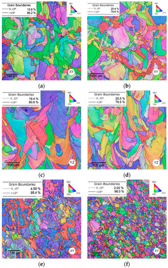 As can be seen, the SLM + RS sample featured a significant decrease in HAGB in the horizontal XY plane from 86.2% to 73.3% (see Figure 9a) at the border as well as from 79.6% to 66.9% (see Figure 9b) in the centre of the sample. This was a decrease of 12.9% at the border and 13% in the centre of the sample. Considering the vertical YZ plane a similar course in HAGB fraction was observed, i.e., from 80.6% to 63.4% (a decrease of 17.2%, see Figure 9d) at the border and from 79.5% to 76.5% (a decrease of 3%, see Figure 9e) in the centre. The CON + RS sample exhibited a similar trend of HAGB fraction, which decreased at the border and in the centre of the sample within both planes.