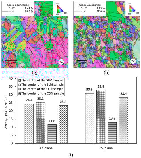 EBSD orientation image maps of the SLM and CON samples: (a) a border of the SLM sample and (b) a centre of the SLM sample in the XY plane, (c) a border of the SLM sample and (d) a centre of the SLM sample in the YZ plane, (e) a border of the CON sample and (f) a centre of the CON sample in the XY plane, (g) a border of the CON sample and (h) a centre of the CON sample in the YZ plane (i) a summary of all states of the average grain sizes in the XY and YZ planes.
