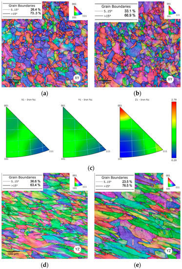 EBSD orientation image maps for the samples exposed to hot rotary swaging (SLM + RS) and (CON + RS) are presented in Figure 9. The hot rotary swaging caused significant structure and geometrical changes resulting in a decrease in the average grain size and the proportion of HAGB fraction. A fully recrystallized structure of the 316L stainless steel was formed during post-processing by hot rotary swaging. The structure consists of small epitaxial grains formed in the horizontal direction, while the structure in the vertical direction exhibits grains with their longer axis formed predominantly parallel to the building direction. This phenomenon corresponds with the process of hot rotary swaging, where the sample was processed with four dies rotating around the sample. The crystallographic texture in the border areas of the XY and YZ planes of the SLM + RS was evaluated via the inverse pole figures (IPFs, depicted in Figure 9c,f). The structure exhibited a relatively strong tendency to form the <001> axis (‖z) and <101> (‖z) preferential orientations in the horizontal and vertical directions.